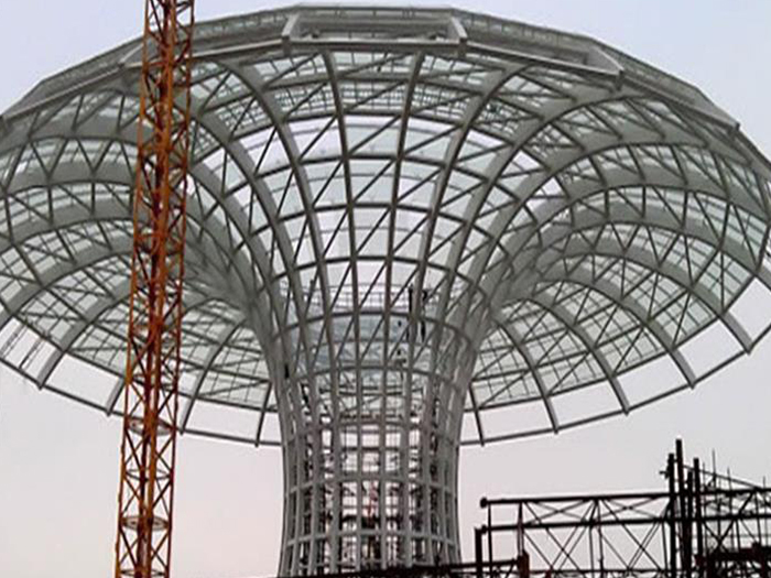 二、球形网架结构因其结构新颖,受力合理,自重轻、用钢量低等优点。如大型体育场馆球形根河螺栓球网架、公共场馆球形网架、电厂根河螺栓球网架、水泥工业球形网架、仓储物流球形网架、根河干煤棚工业球形网架、根河收费站根河加油站球形网架、展览中心、影剧院、商场、航站楼、候车厅、工厂根河车间、仓库、电视塔等球形螺栓球节点网架。国内球形网架结构主要分为:根河焊接球节点网架及螺栓球节点网架两种。螺栓球节点网架其构件工厂内加工量较大,现场安装便捷,适用于现场工期紧,根河施工条件、用电量受制约,网架形状复杂、根河杆件定位困难的异形结构。螺栓球节点球形网架系统基本由根河杆件、螺栓球、支撑支座等组成。按照节点形式可分为交叉根河桁架体系、四角锥体系、三角锥体系等。支撑方式多为固定支座支撑。对于大面积、大跨度及有特殊受力或伸缩要求的网架结构可采用橡胶支座、滑移支座、球铰支座等支撑形式,以满足结构自身的受力稳定、均衡,便于内力释放等设计要求。